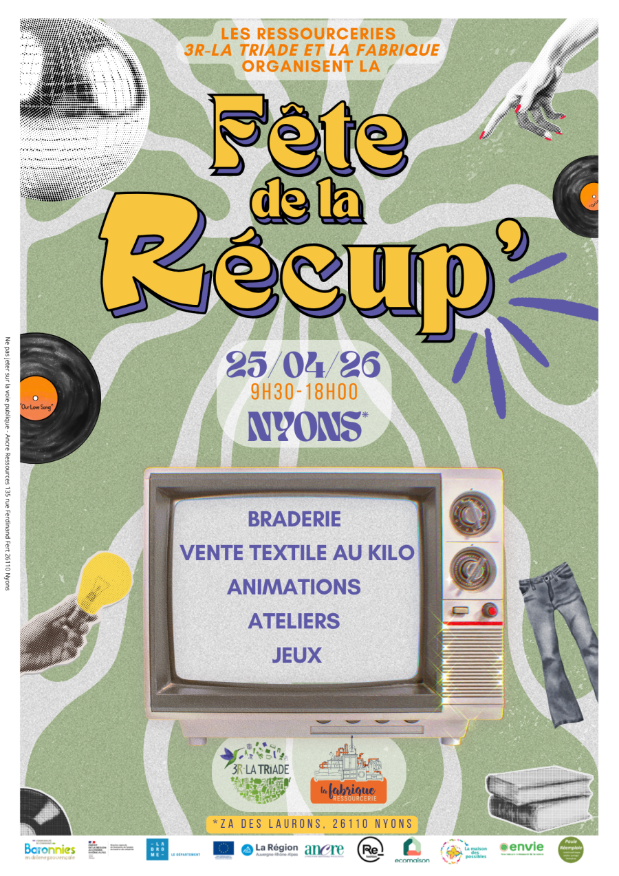 Pour la cinquième année consécutive, la ressourcerie 3R-La Triade fait la fête ! Cette année le samedi 25 avril nous vous proposons une grande journée pour célébrer la récup' sous toutes ses formes et déstocker nos articles. Nous organisons cette journée en partenariat avec La Fabrique pour faire de la zone des laurons à Nyons un grand marché des objets de seconde main.
