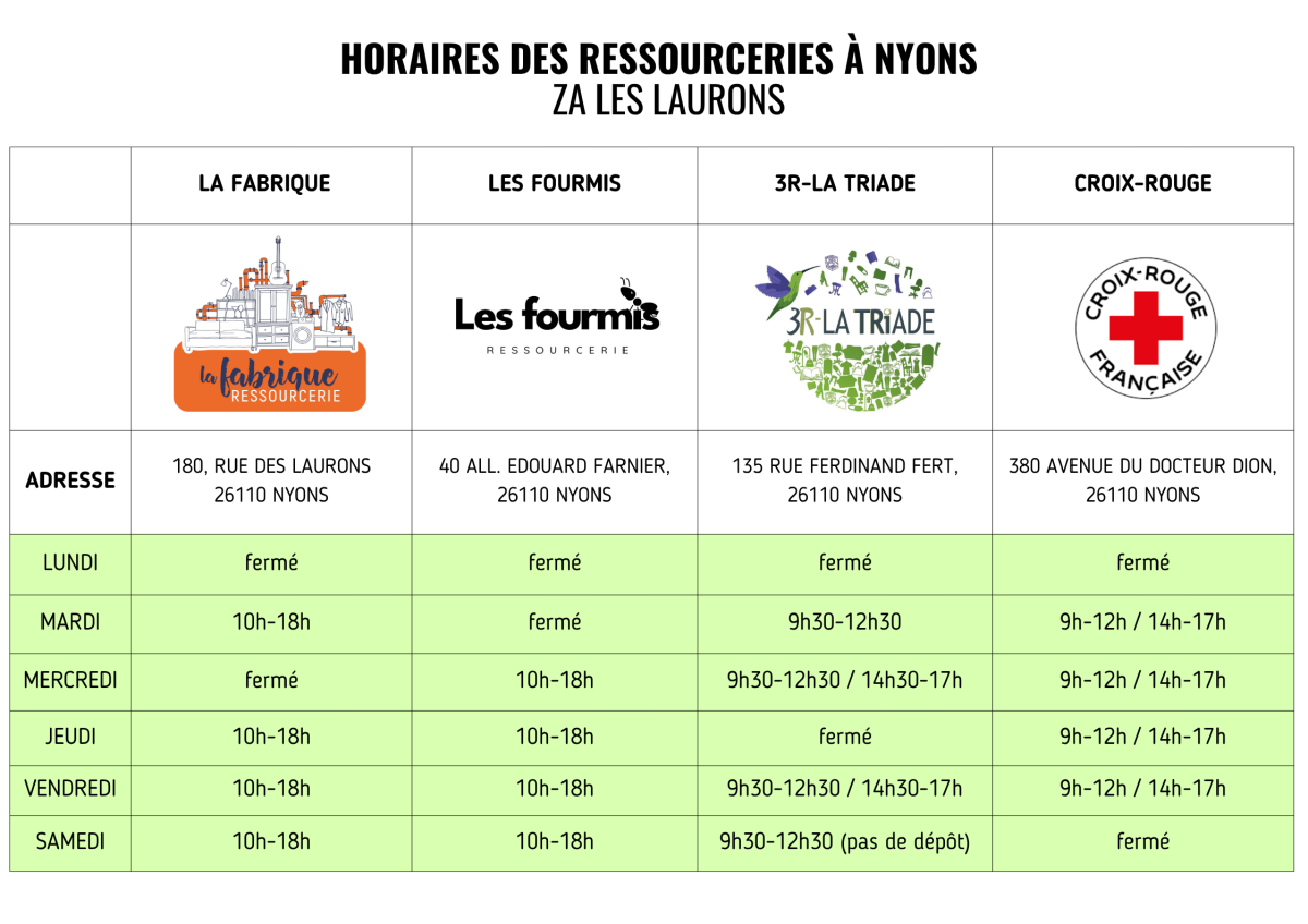 Ci-joint le tableau des horaires des autres ressourceries de la zone des laurons. Avec ça, vous multipliez vos chances de trouver ce que vous recherchez !
